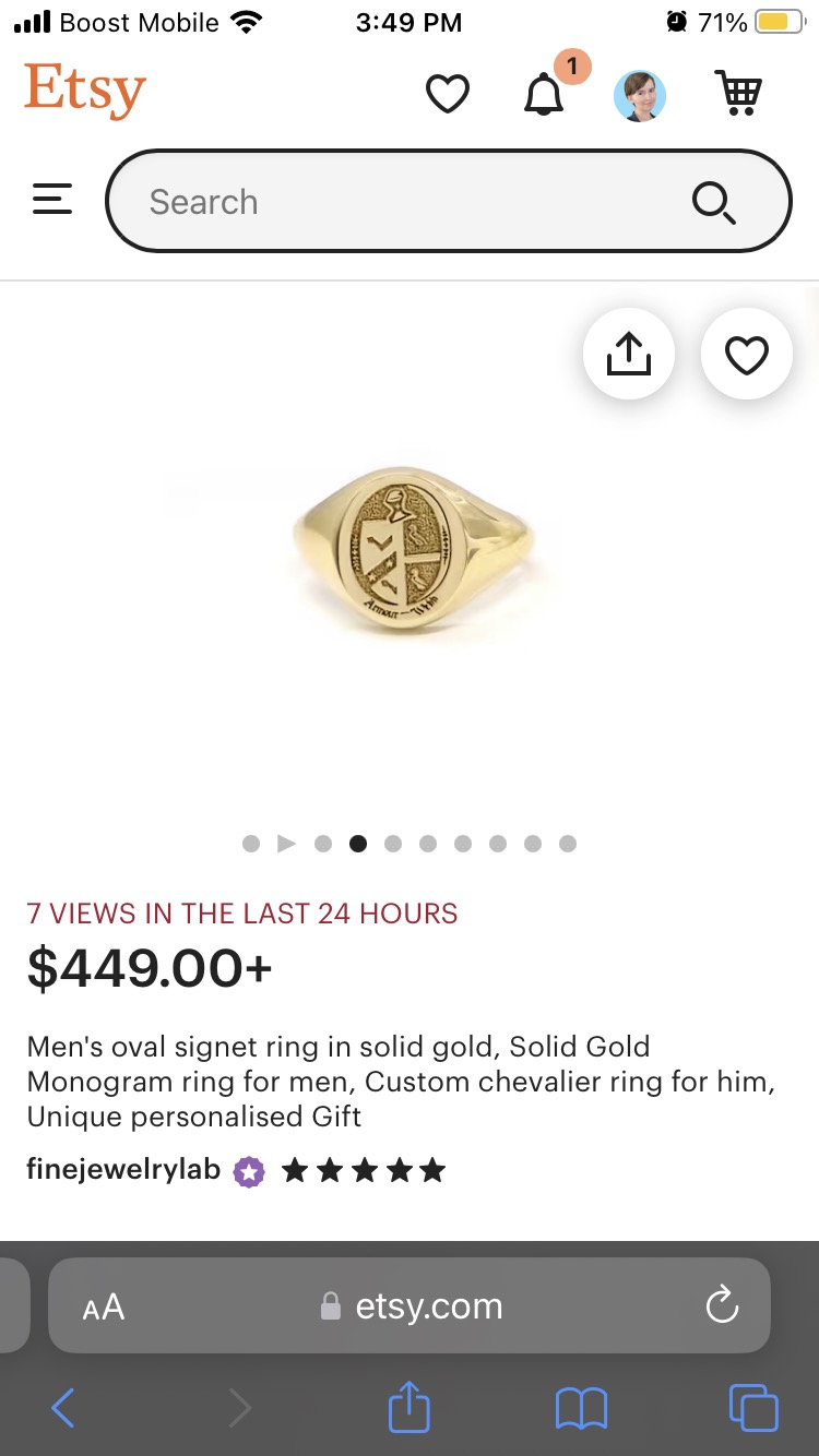 Recently, my family crest design was featured on an Etsy shop for their signet rings. I purchased from them in the past for personal rings for my husband and myself.