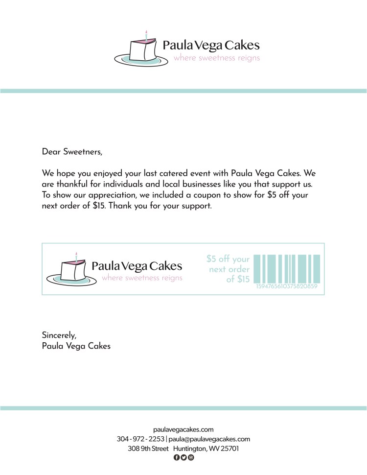 Paula Vega Cakes Redesign Portfolio Business Card Catering Invoice Email and Letter Campaign Promotional Stickers Share this: Click to share on X (Opens in new window) X Click to share on Facebook (Opens in new window) Facebook Like Loading...